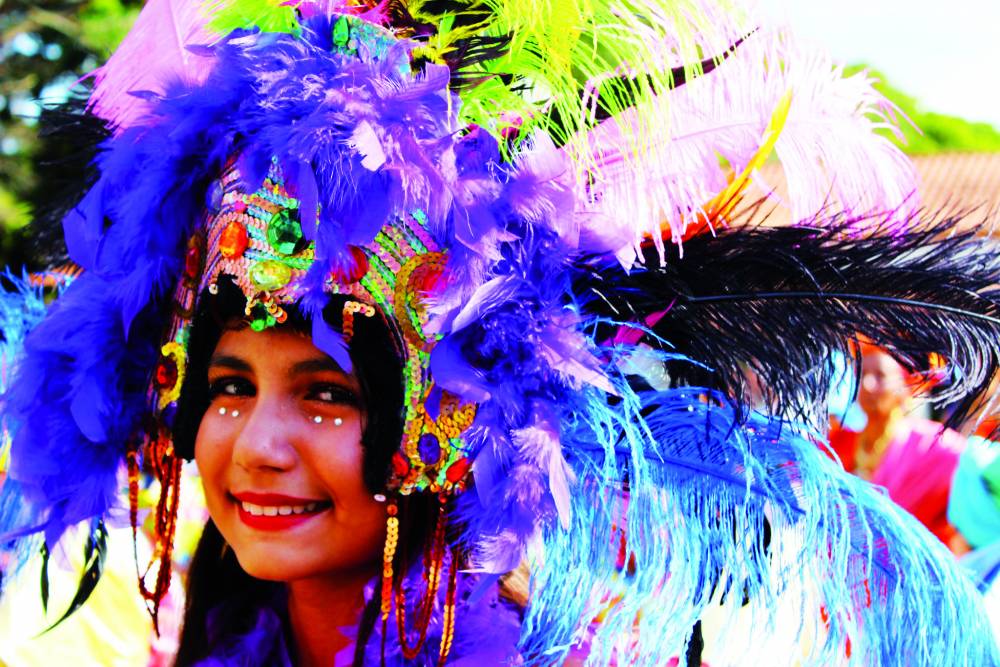Luego van las bailarinas, también conocidas como «fantasías», que usan plumas grandes y verdes, amarillas, azules, naranjas, con tonos intensos y combinados de trópico como sus vestidos.
