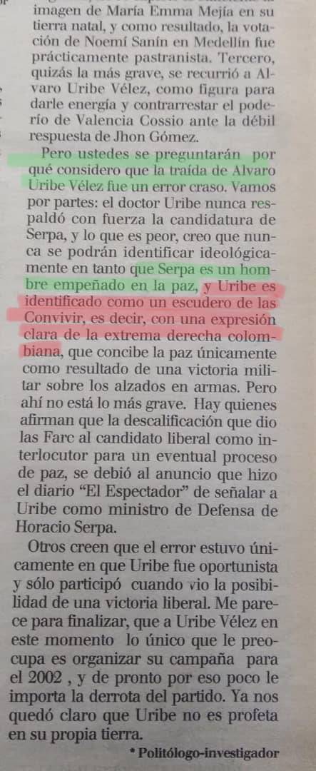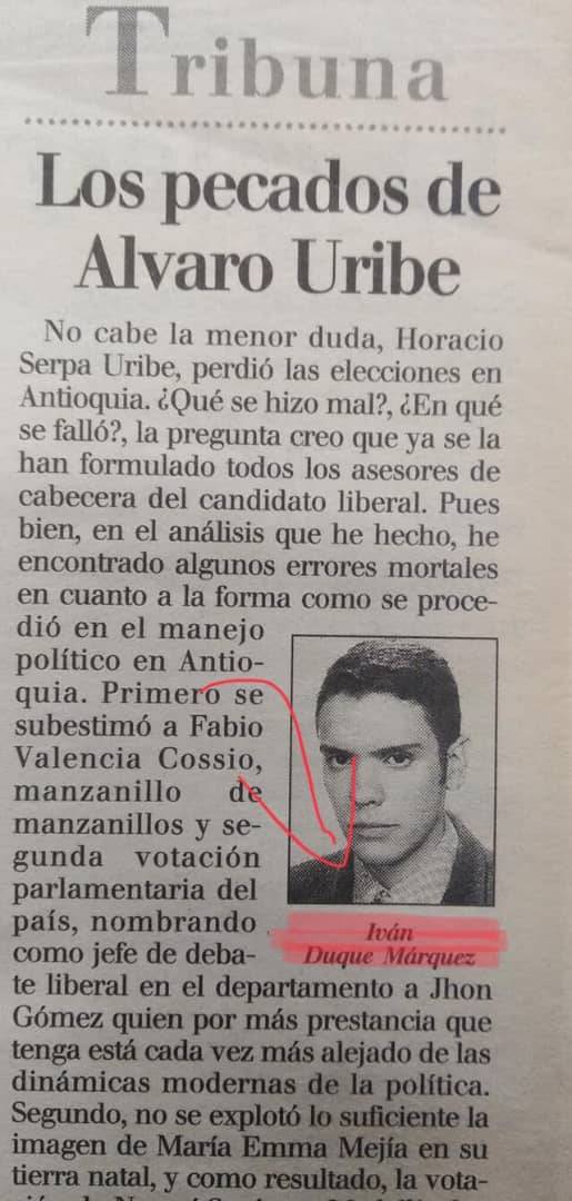 De acuerdo con el diario El Espectador, en el artículo Duque realizó varios análisis del por qué Horacio Serpa Uribe, candidato liberal, no ganó en Antioquia, durante elecciones de 1998. Y la que más resalta es donde él mismo confirma y evidencia que su mentor Uribe Vélez es un paraco que nunca ha querido la paz para Colombia.