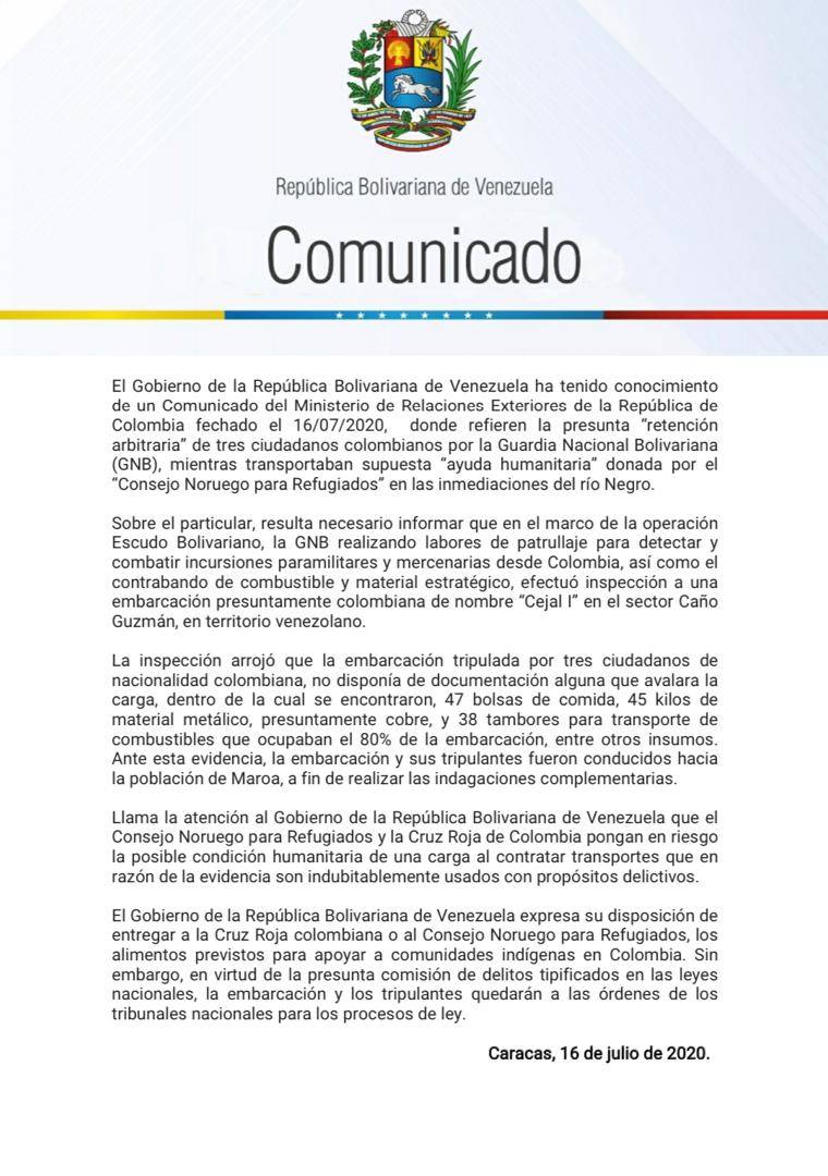 El Canciller venezolano Jorge Arreaza informó mediante su cuenta twitter que durante sus labores de patrullaje fue interceptada en el sector Caño Guzmán la embarcación colombiana “Cejal I”, con características delictivas propias del contrabando de combustible, siendo camuflajeadas como una supuesta ayuda humanitaria.