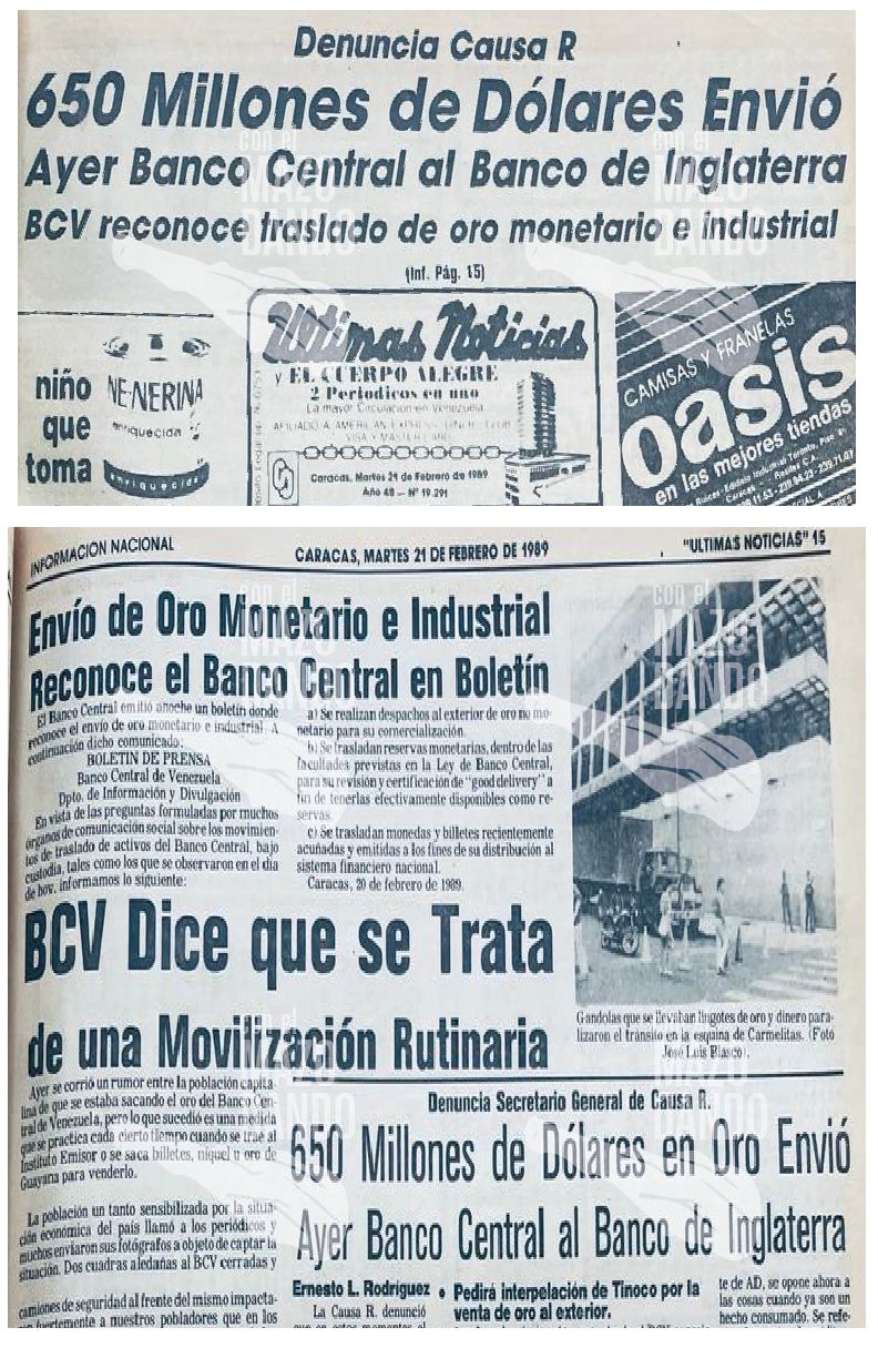 - En medio de una oleada de protestas estudiantiles, ocasionadas por el anuncio del paquetazo neoliberal, Carlos Andrés Pérez (CAP) ordenó, bajo la aplicación de estrictas medidas de represión policial, el primer embarque de ocho toneladas de oro de las bóvedas del Banco Central de Venezuela (BCV) con destino a las bóvedas del Banco de Inglaterra.