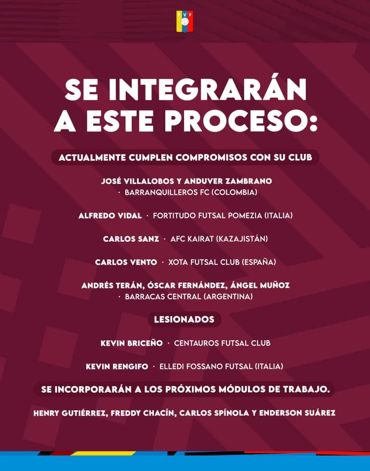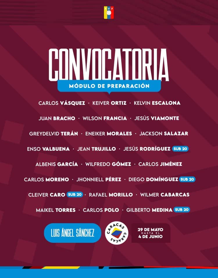 El seleccionador nacional Luis Ángel Sánchez realiza su primera convocatoria al frente de la Vinotinto de Futsal, para el módulo de preparación que se llevará a cabo del 29 de mayo al 4 de junio de 2022.Carlos Vásquez, Keiver Ortiz, Kelvin Escalona, Juan Bracho, Wilson Francia, Jesús Viamonte, Greydelvid Terán, Eneiker Morales, Jackson Salazar, Jesús Rodríguez, Enso Valbuena, Jean Trujillo, Albenis García, Wilfredo Gómez, Carlos Jiménez, Carlos Moreno, Jhonniell Pérez, Diego Domínguez, Cleiver Caro, Rafael Morillo, Wilmer Cabarcas, Maikel Torres, Carlos Polo y Gilberto Medina, son los jugadores llamados para iniciar este ciclo.