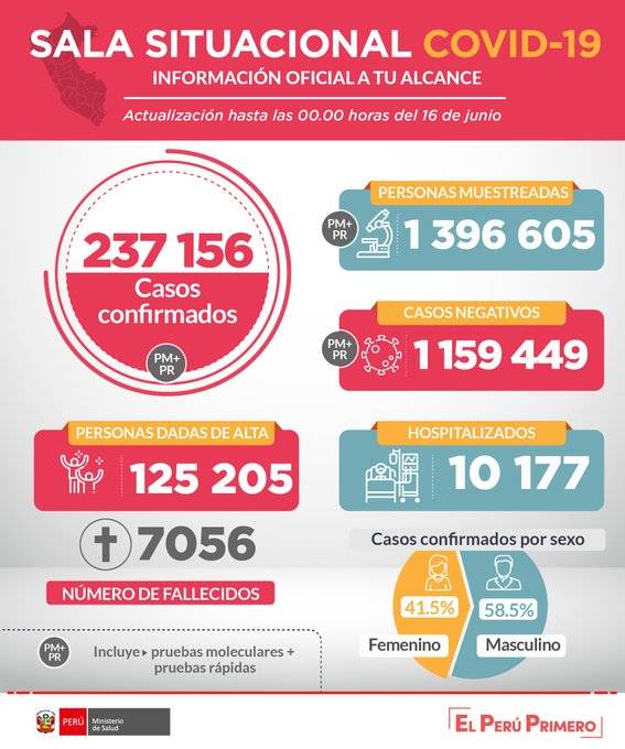 Este martes 16 de junio, Perú alcanzó las 7.056 víctimas fatales desde el inicio de la pandemia del coronavirus, al registrar 196 decesos en el último día, según informó el Ministerio de Salud.
