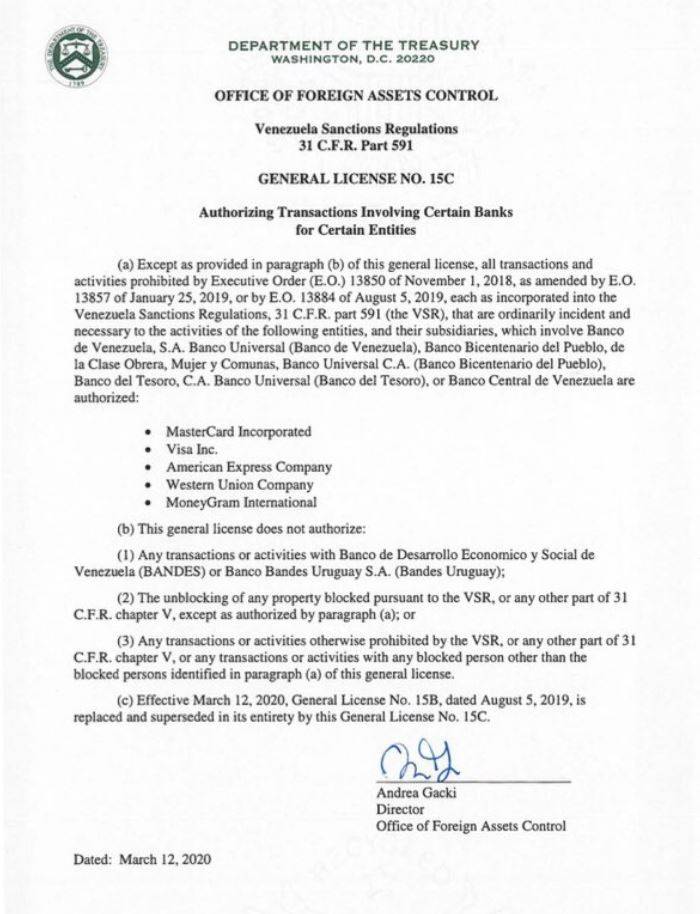 El Departamento del Tesoro de Estados Unidos autorizó el jueves la continuidad de operaciones de los proveedores de tarjetas de crédito Visa y MasterCard, así como a los poseedores de instrumentos de American Express, Western Union y Moneygram en los bancos públicos de Venezuela, algo que no podían hacer desde marzo de 2019 por orden del presidente norteamericano Donald Trump.