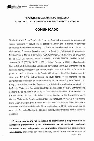El Ministerio de Comercio Nacional, informó este viernes, a través de un comunicado oficial, que sectores que conforman la cadena de distribución de alimentos perecederos y no perecederos como: supermercados, bodegas de víveres, abastos, charcuterías, carnicerías y panaderías, cumplirán una jornada especial de atención al público desde las 08:00 a.m. hasta las 06:00 p.m.