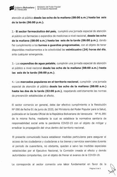 Asimismo, el comunicado expresa que los mercados populares o a cielo abierto cumplirán un horario de atención desde las 08:00 a.m. hasta las 02:00 p.m., respetando estrictamente las normas de prevención establecidas al efecto, a fin de evitar concentraciones y aglomeraciones en estos espacios.