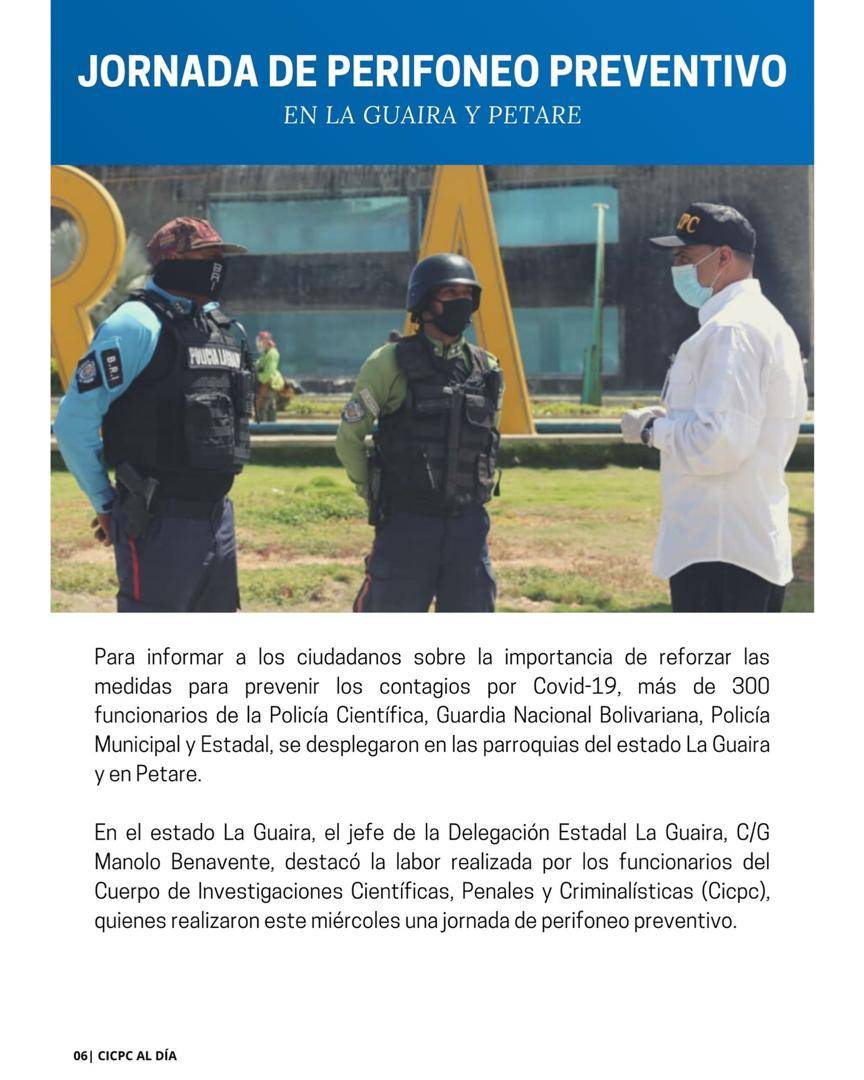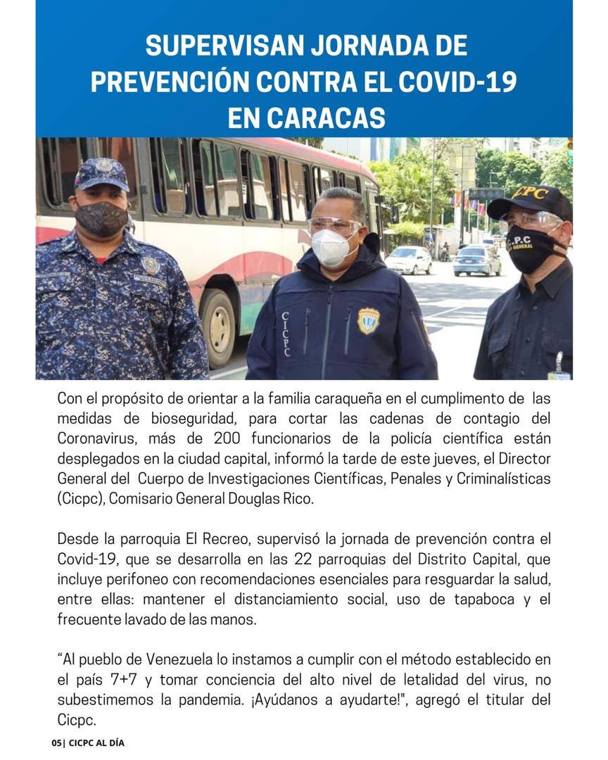 Unidad y solidaridad es lo que impera después de más de 130 días de Coronavirus. El Ejecutivo Nacional hace un gran esfuerzo para contener los contagios, los cuerpos de seguridad estamos haciendo un trabajo en equipo que busca hacer cumplir la cuarentena social colectiva y voluntaria. Antes que llegue una cura definitiva, debemos cuidarnos y cuidar a nuestras familias, la recomendación más contundente es quedarse en casa, es el método más efectivo y somos nosotros los responsables. Sigamos adelante, por una patria que espera lo mejor de sus hijos. No vamos a descansar, el trabajo nos hace útiles y mejores. Los invito a leer Cicpc Al Día, donde damos a conocer parte del trabajo de nuestra institución, recuerden: compartan el boletín con familiares y amigos. Feliz domingo y quédate en casa.