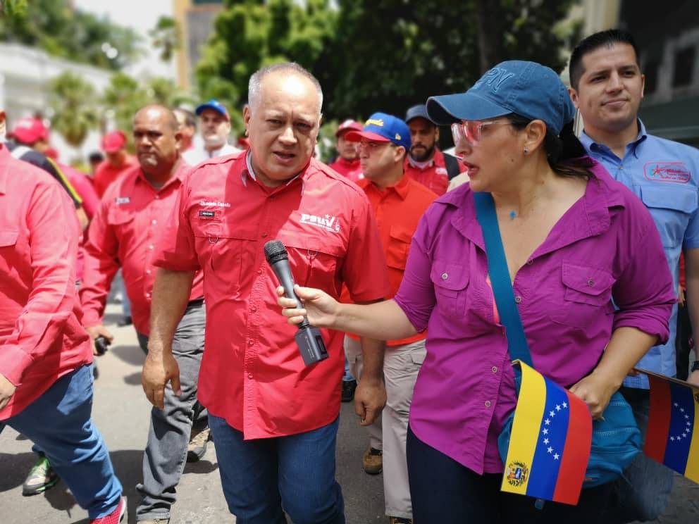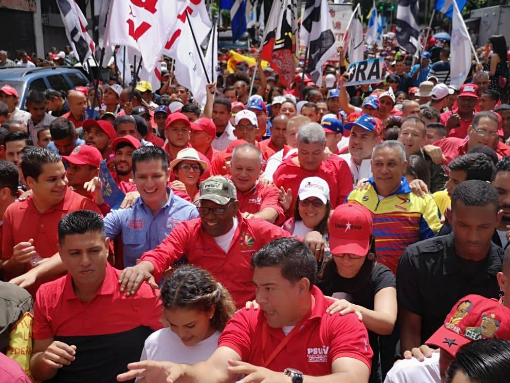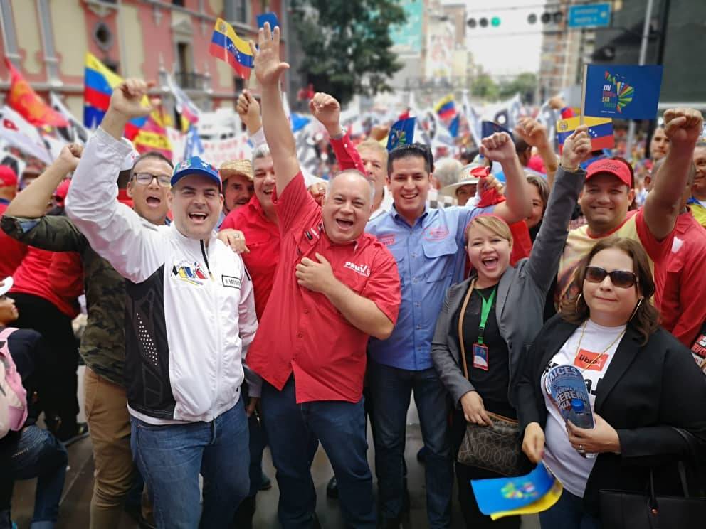 Tras ofrecer palabras finales durante el encuentro parlamentario del foro de Sao Paulo, el primer vice presidente del Partido Socialista Unido de Venezuela (Psuv) y presidente de la Asamblea Nacional, Diosdado Cabello caminó junto con los delegados internacionales y pueblo desde Puente Llaguno hasta Plaza Morelos en la llamada Marcha antiimperislita y de solidaridad por la paz.