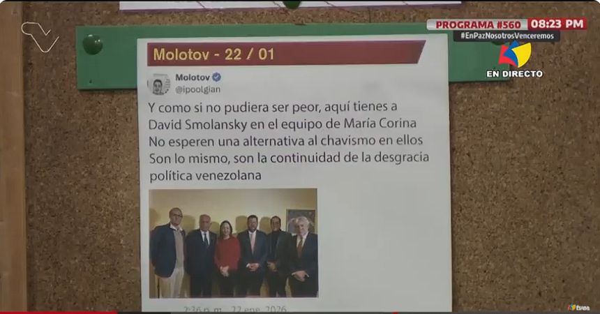 During the Con El Mazo Dando program number 560, Diosdado Cabello Rondón exhibited a user by the name of Molotov on the billboard of the communication space in which he describes the extreme right-wingers David Smolasky and María Corina Machado as the “continuity of Venezuelan political disgrace”.