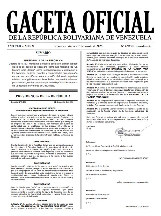 El presidente de la República, Nicolás Maduro, mediante el decreto número 5.153 de fecha 1° de agosto, declaró el primer sábado del mes de agosto de cada año como Día Nacional de "La Marcha para Jesús", como reconocimiento y exaltación a los hombres, mujeres, pueblos y comunidades que cada año evocan su devoción en esta expresión del sentir espiritual cristiano evangélico venezolano, fecha que servirá, además, para celebrar, enaltecer y divulgar en el país los valores de Jesucristo.