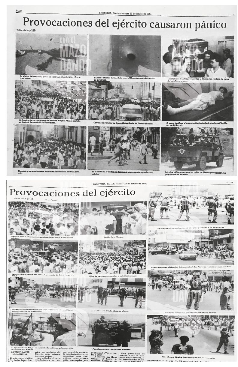 - Durante el sepelio de Magdiel Páez García, nuevamente el Ejército hizo acto de presencia disparando ráfagas al aire para impedir las multitudinarias manifestaciones que invadieron las calles de la ciudad de Mérida, por el absurdo asesinato de los dos jóvenes estudiantes.