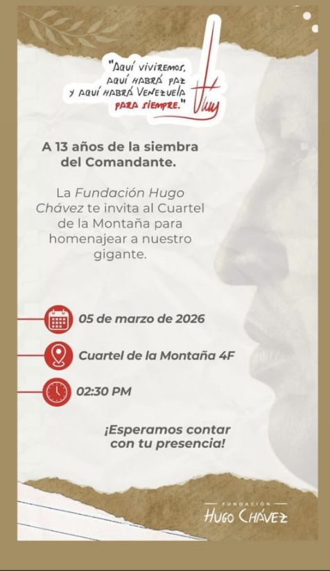 Igualmente, la institución aprovechó la oportunidad para invitar al Pueblo al Cuartel de la Montaña para el homenaje que se realizará este jueves, 05 de marzo, a partir de las 2:30 de la tarde, a este Gigante de la Revolución Bolivariana.