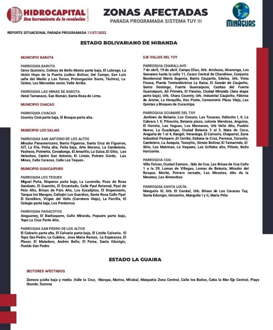 La Hidrológica de la Región Capital (HIDROCAPITAL) informa que será interrumpido por un lapso de 48 horas el servicio del vital líquido por labores de mantenimiento preventivo y correctivo en el Sistema Tuy III en zonas de la Gran Caracas.