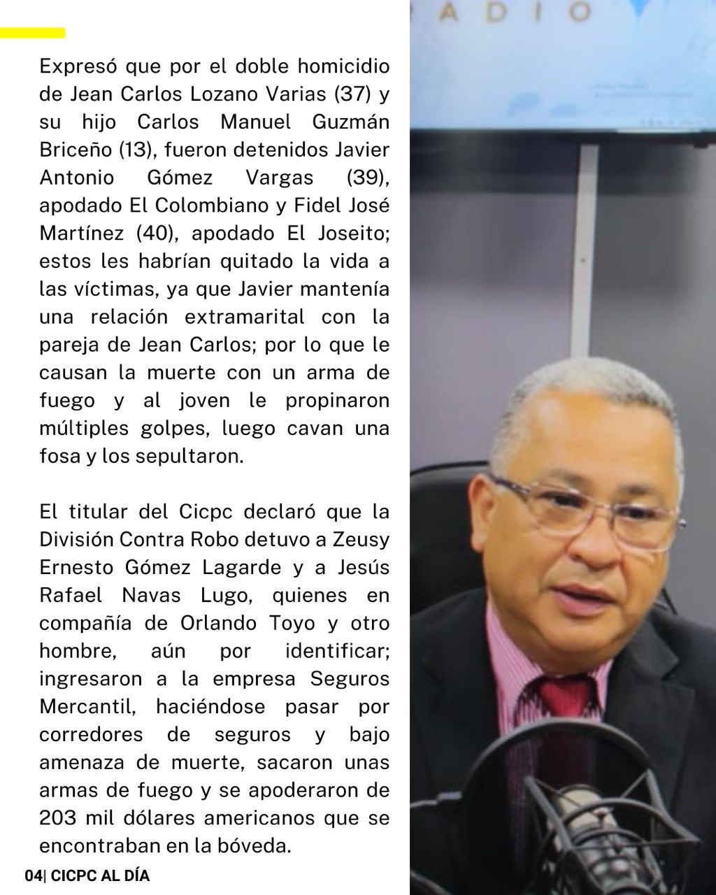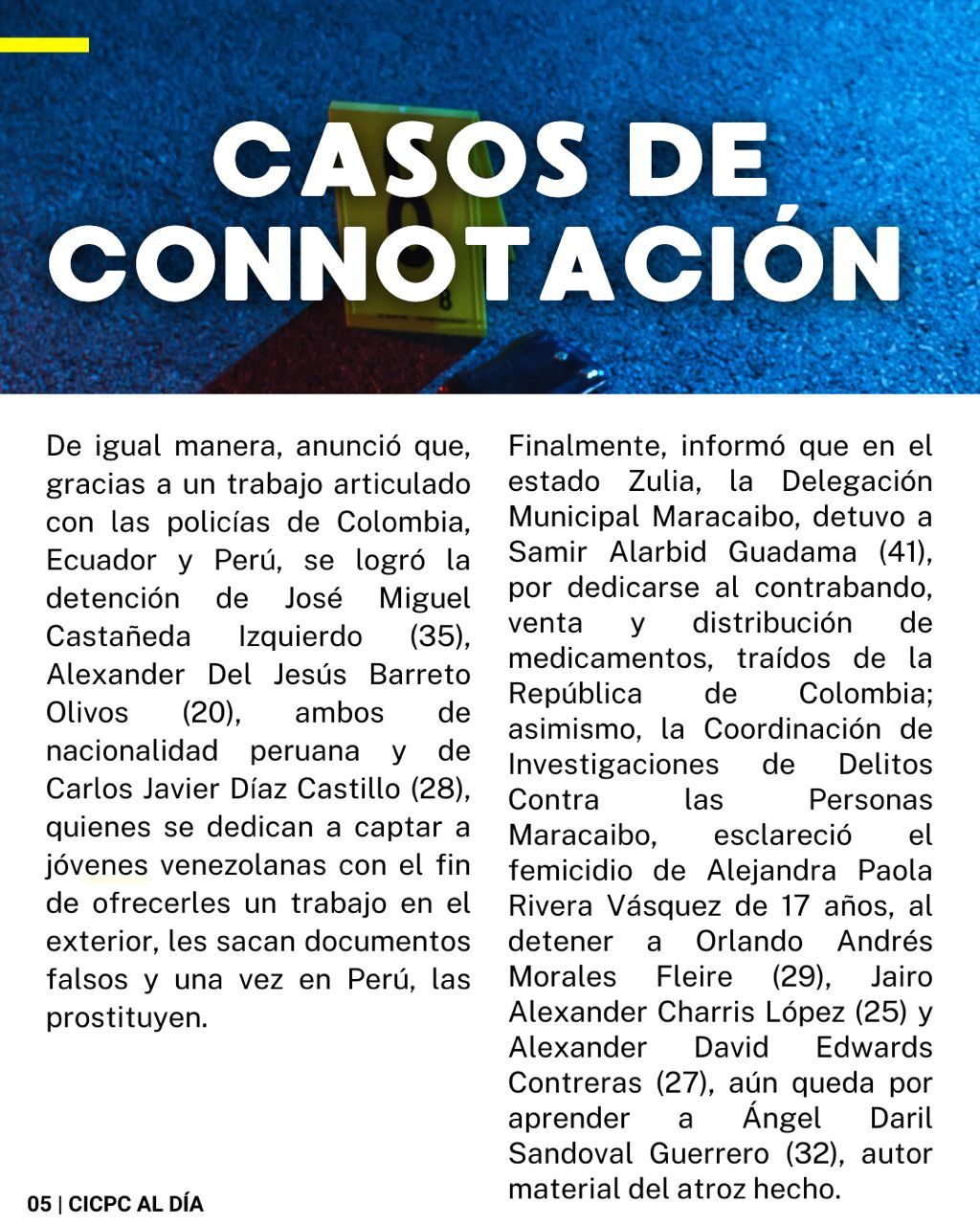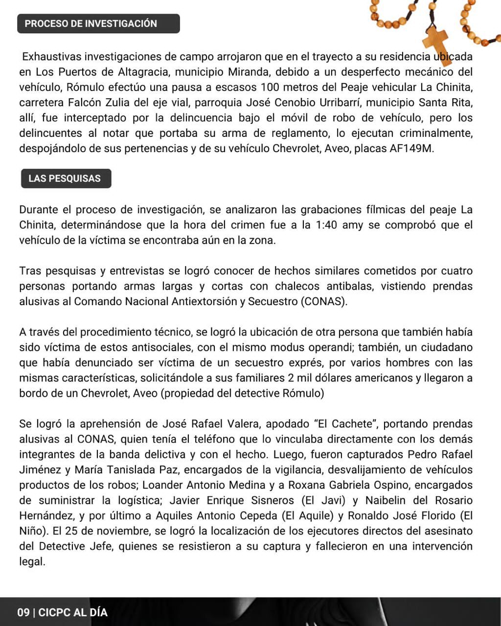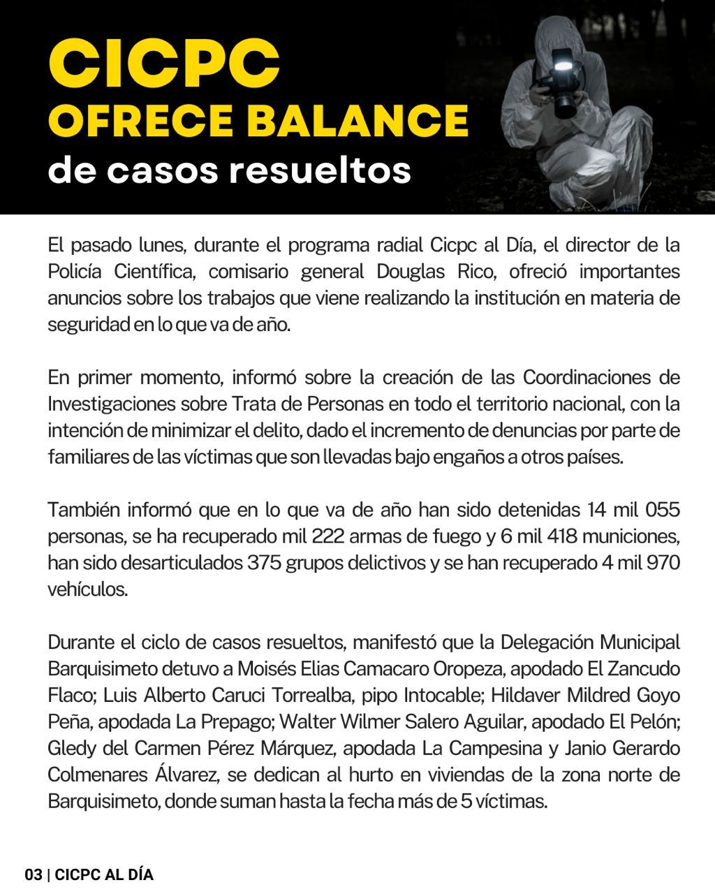 "Presentamos hoy la edición 176 del Boletín CICPC Al Día, con ello, damos difusión a parte del trabajo que realiza nuestra institución. Es necesario mencionar que ser policía, es estar sometido a constantes presiones, y siempre vamos en procura de la Paz y Seguridad Ciudadana. Esta semana, en una operación contra una banda criminal, perdimos a uno de nuestros funcionarios. Lamentamos profundamente su pérdida y ofrecemos toda nuestra solidaridad a familiares y amigos. El CICPC, pese al dolor, sigue adelante con la moral bien en alto, porque como dijo el Cantor del Pueblo: “Los que mueren por la vida, no pueden llamarse muertos”. Recuerde, comentar esta lectura, con familiares y amigos, es justo y necesario", señala nota de prensa que acompaña la publicación.