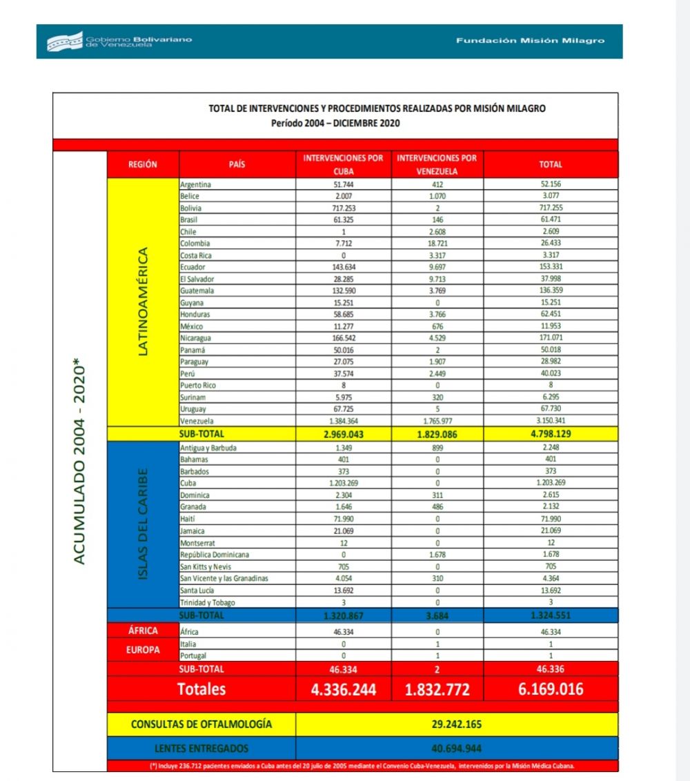 La Misión Milagro ha atendido más de 6.169.016 de personas entre Latinoamérica, El Caribe, África y Europa durante el periodo 2004-2020.