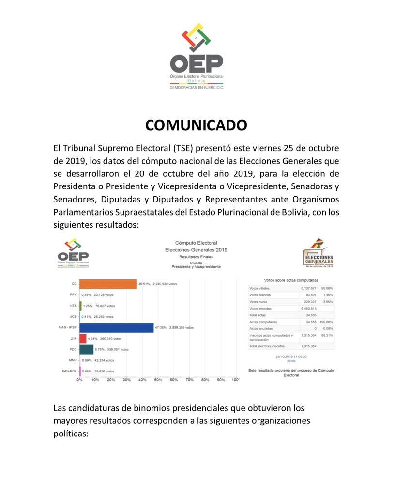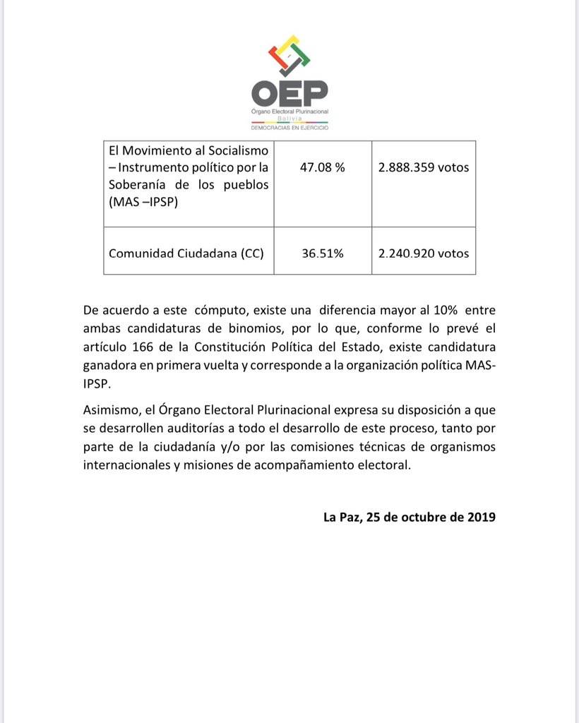Asimismo, adjunt para conocimiento de todo el mundo, el comunicado oficial de la victoria del presidente de Bolivia Evo Morales. “No hay poder extranjero que pueda derrotar la determinación del pueblo de vivir en paz y libertad”.