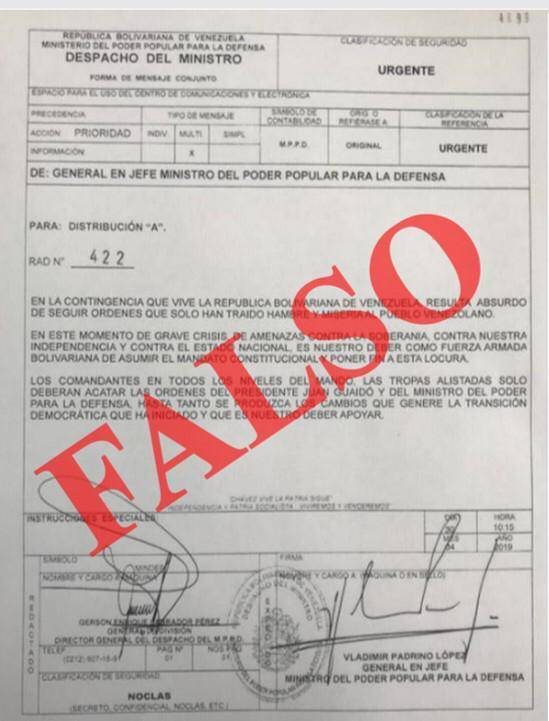 El supuesto comunicado de manera malintencionada muestra que el ministro de la Defensa, el General en Jefe Vladimir Padrino López, da la orden a todos los Comandantes de los Altos Mandos y unidades militares de seguir las órdenes de Guaidó y de su persona "hasta que se genere la transición democrática".