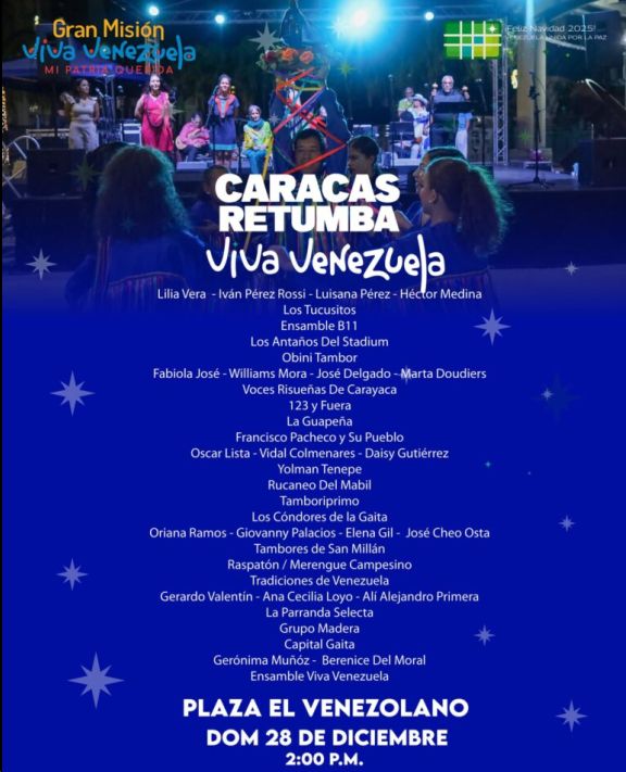 La actividad se realizará este domingo 28 de diciembre, a partir de las 2:00 pm, en la plaza El Venezolano, emblemático espacio del centro histórico de Caracas, que se llenará de cantos, tambores y expresiones artísticas provenientes de distintas regiones del país.