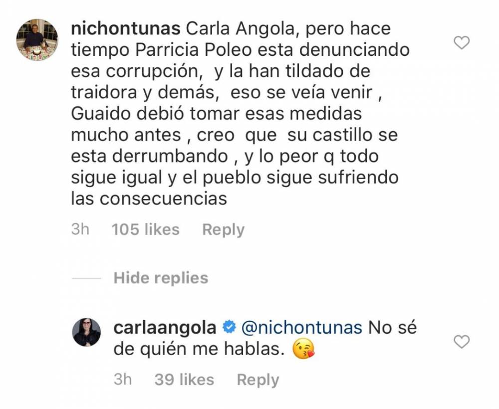 Angola publicó una noticia de los parlamentarios implicados en una trama de corrupción relacionada con Alex Saab, acusado de vender alimentos con sobreprecio a través de los Comités Locales de Abastecimiento y Producción (Clap). A lo que el usuario respondió: “Pero hace tiempo Patricia Poleo está denunciando esa corrupción y la han tildado de traidora y demás”. Ante ese comentario Angola respondió: “No sé de quién me hablas”.