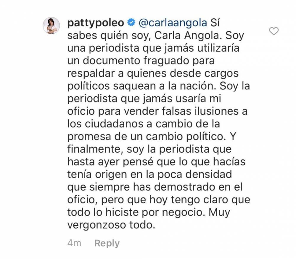 Luego del comentario de Angola, Poleo no se aguantó y le respondió: “Sí Sabes quién soy, Carla Angola. Soy una periodista que jamás utilizaría un documento fraguado para respaldar a quienes desde cargos políticos saquean a la nación. Soy la periodista que jamás usaría mi oficio para vender falsas ilusiones a los ciudadanos a cambio de la promesa de un cambio político. Y finalmente, soy la periodista que hasta ayer pensé que lo que hacías tenía origen en la poca densidad que siempre has demostrado en el oficio, pero hoy tengo claro que todo lo hiciste por negocio. Muy vergonzoso todo”.