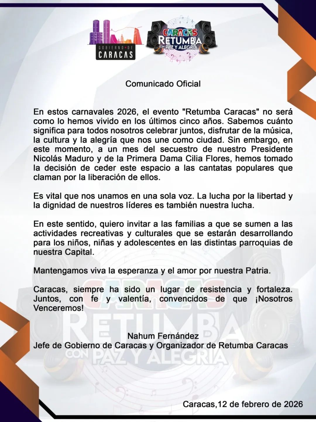 A través de un comunicado, el Gobierno de Caracas anunció que el evento musical “Retumba Caracas” cederá su espacio, en estos Carnavales 2026, a las cantatas populares por la liberación del presidente constitucional Nicolás Maduro y la primera combatiente, Cilia Flores, tras la agresión militar del pasado 3 de enero.