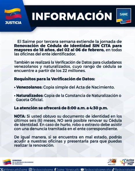 SAIME anunció la extensión de las jornadas de renovación de cédula sin cita hasta el 6 de febrero