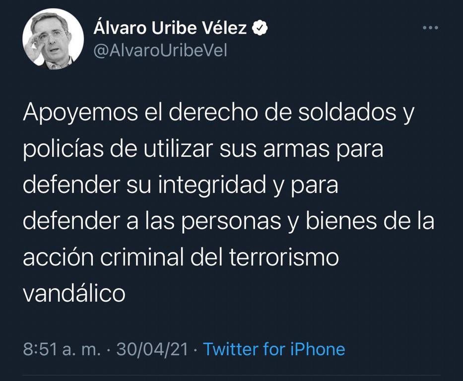En Tweet, Uribe afirmó: "Apoyemos el derecho de soldados y policías de utilizar sus armas para defender su integridad y para defender a las personas y bienes de la acción criminal del terrorismo vandálico".