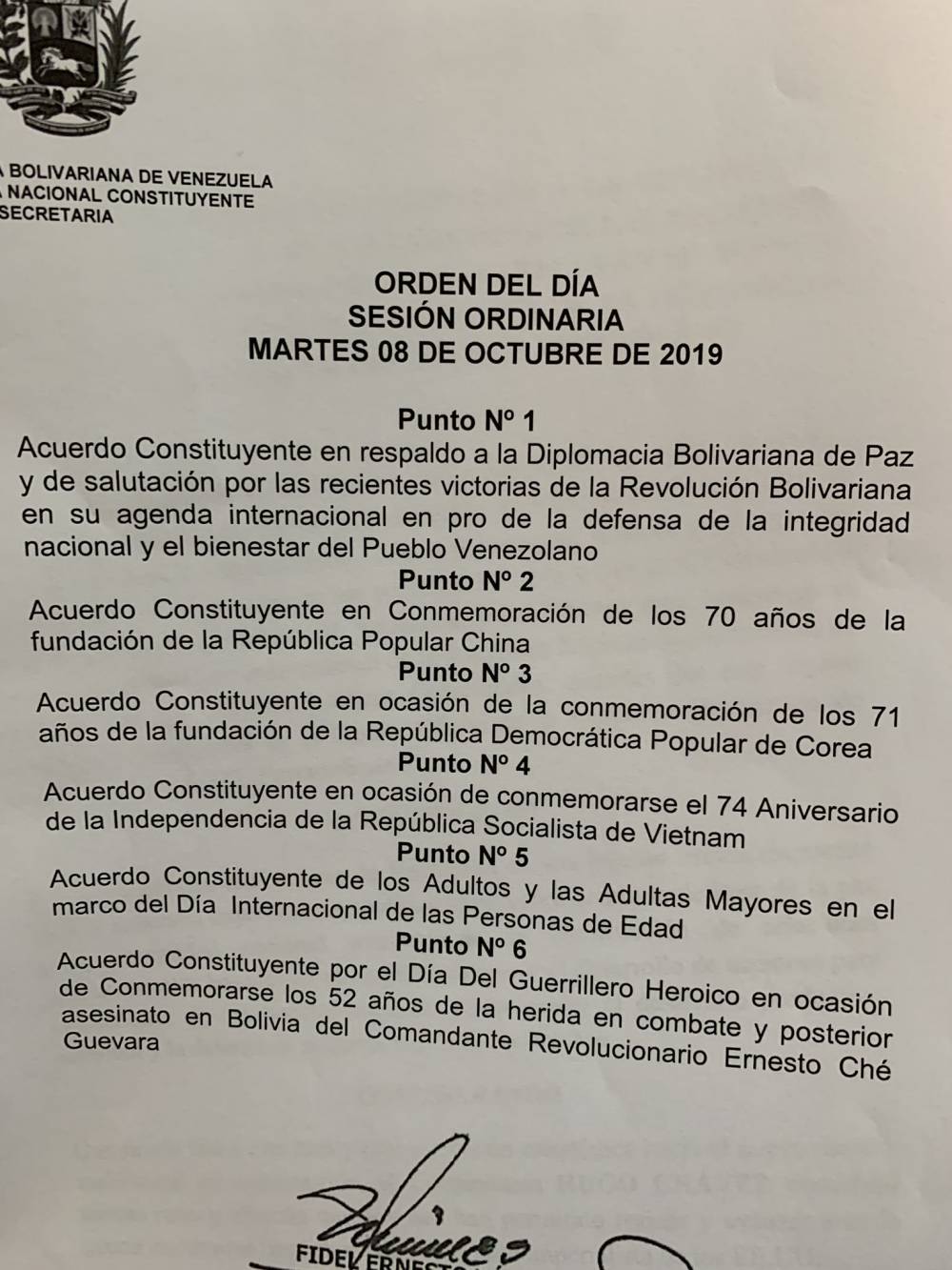 En principio, estaba previsto el Acuerdo Constituyente en respaldo a la Diplomacia Bolivariana de Paz y de salutación por las recientes victorias de la Revolución Bolivariana en su agenda internacional en pro de la defensa de la integridad nacional y el bienestar del Pueblo Venezolano.