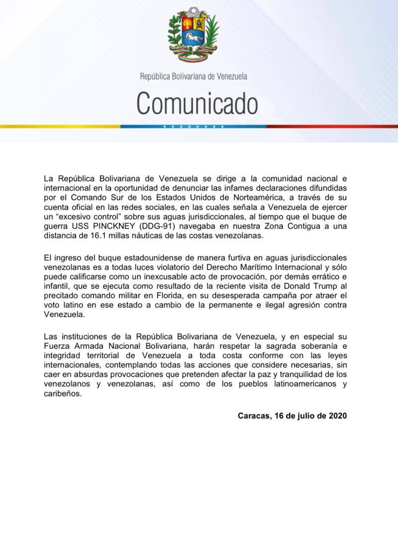 La República Bolivariana de Venezuela, a través de un comunicado oficial difundido por el canciller Jorge Arreaza en sus redes sociales, denunció este jueves el ingreso furtivo en la Zona Contigua, del buque de guerra estadounidense: USS PINCKNEY (DDG-91).