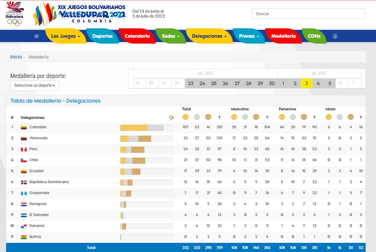 Con un total de 120 medallas acumuladas Venezuela ocupa el segundo lugar del medallero en los XIX Juegos Bolivarianos Valledupar 2022, mientras que el líder de la tabla es el país anfritión Colombia con un total de 210 preseas y Perú queda hasta los momentos en el tercer lugar con un total de 97.
