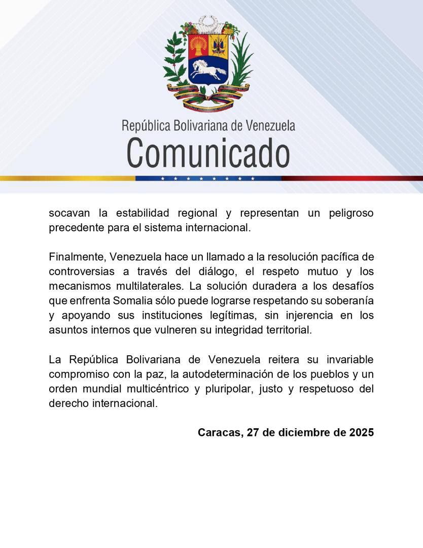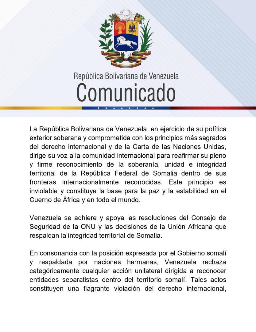 La República Bolivariana de Venezuela reafirmó su reconocimiento a la soberanía, unidad e integridad territorial de la República Federal de Somalia, dentro de sus fronteras internacionalmente reconocidas, y subrayó que este principio constituye un pilar del derecho internacional y de la Carta de las Naciones Unidas, tras la decisión de Israel de reconocer la independencia de Somalilandia.