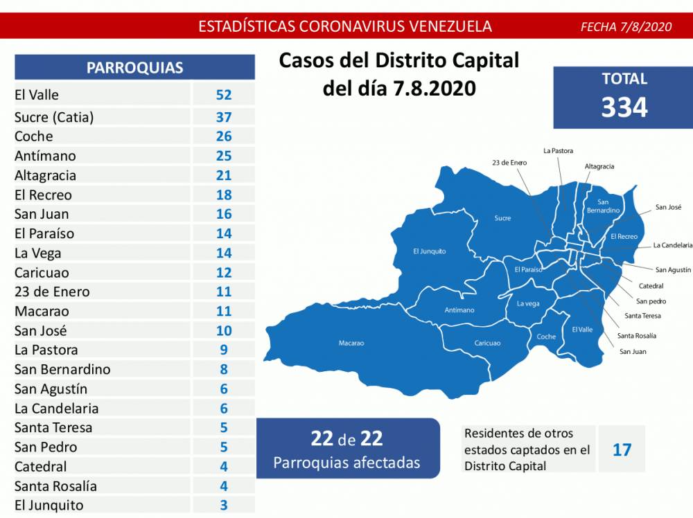 Así lo informó el presidente de la República, Nicolás Maduro, durante jornada de trabajo donde ofreció el balance de las últimas 24 horas, donde precisó que el Distrito Capital, sigue encabezando la lista en incindencia de casos con 334 casos, siendo seguido por Miranda con 222; Zulia con 64 entre otros estados.