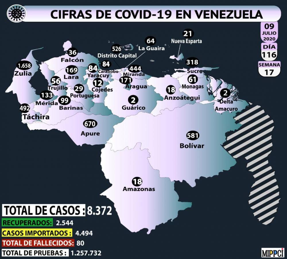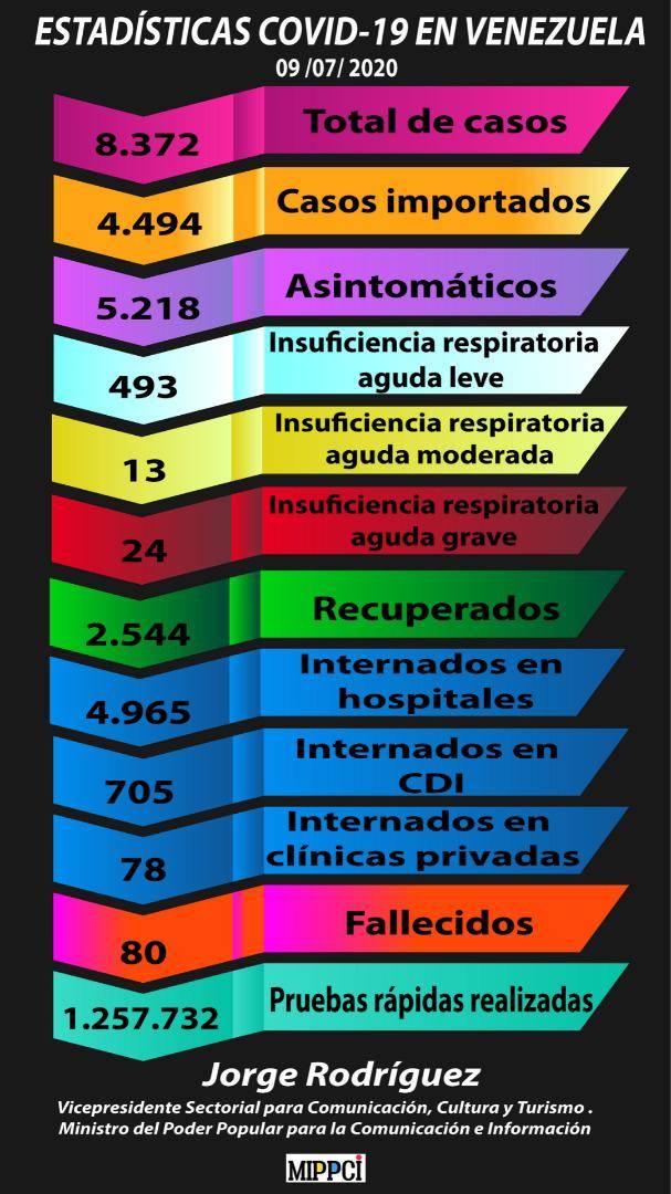 En el balance general Venezuela tiene un total de 8.372 casos; 2.544 pacientes recuperados; 4.965 ingresados en hospitales; 705 en CDI; 78 en clínicas privadas y lamentablemente tenemos 80 fallecidos.