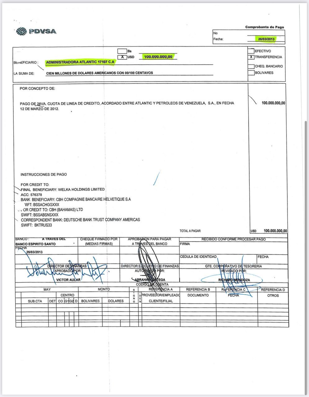 Detalló que la trama corrupta comenzó en febrero de 2012 donde Juan Andrés Wallis Brand, presidente de la Administradora Atlantic 17105 C.A remite una carta a Rafael Ramírez el 29 de ese mes y de ese año, con el objeto de presentarle un supuesto financiamiento de capital de trabajo de PDVSA para un total de 17 mil 490 millones de bolívares fuertes por un plazo de 24 meses.